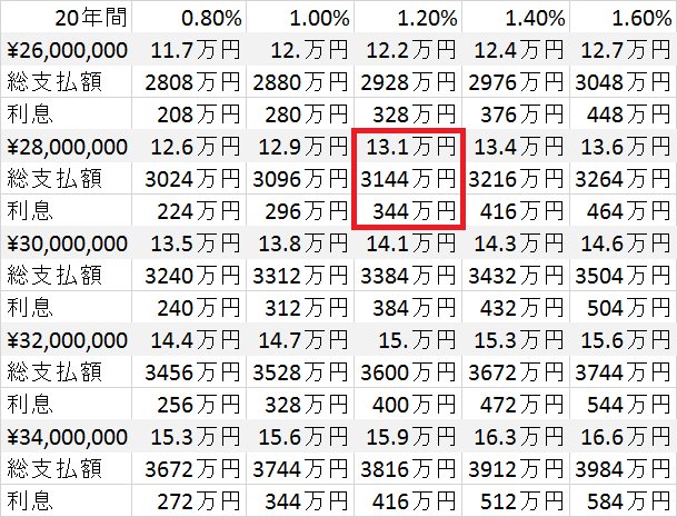 でも毎月の支払いは約12.9万円(最初の10年)、次の10年は毎月約13.1万円になるので、若干金利が低くなりました。