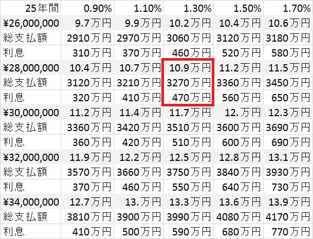 返済期間が25年で年1.30%だと毎月の返済額は約10.9万円で利息は470万円。まだ高いです。
