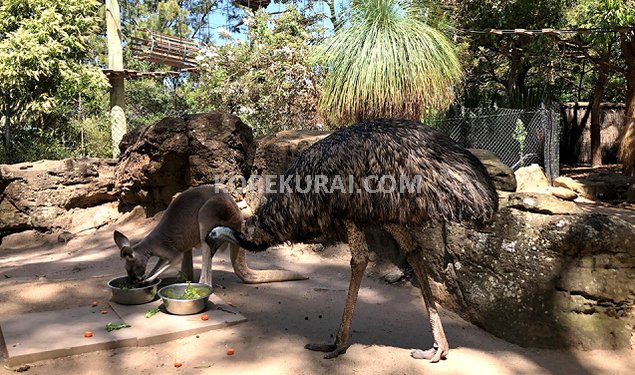 カンガルーとエミューが同じ場所で食事していたのが印象的でした。柵が無いので触ろうと思えば触れる距離ですが、蹴られそうで怖かったので近寄りませんでした。