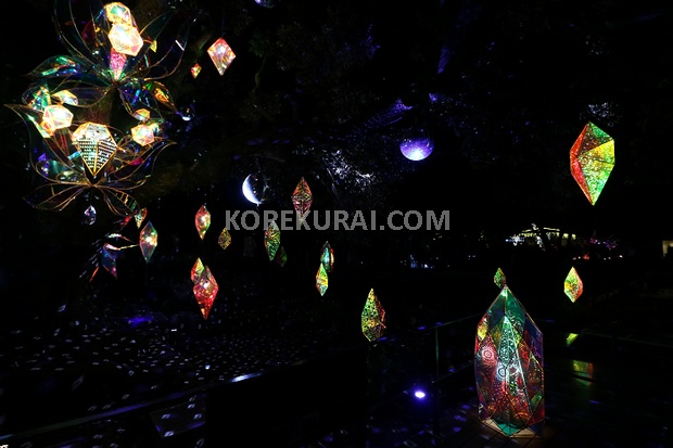 苑内の所々にこのようなクリスタルみたいな形の光るオブジェが設置されてありました。 デザインが面白いですよね。近くで見ると様々な色が反射してとても綺麗です。