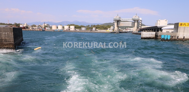 日本で最大の重さ406トンを誇る大型水門びゅうおの扉の下を通ります。扉の高さは9.3メートルで幅は40メートルと大きい。