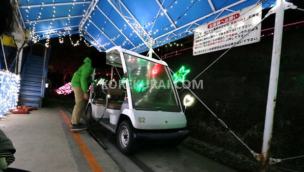自動で走るカートにのってイルミネーションを楽しみます。着いた時は少し並んでたので、閉園時間30分前に行ったら並ばずに乗れました。