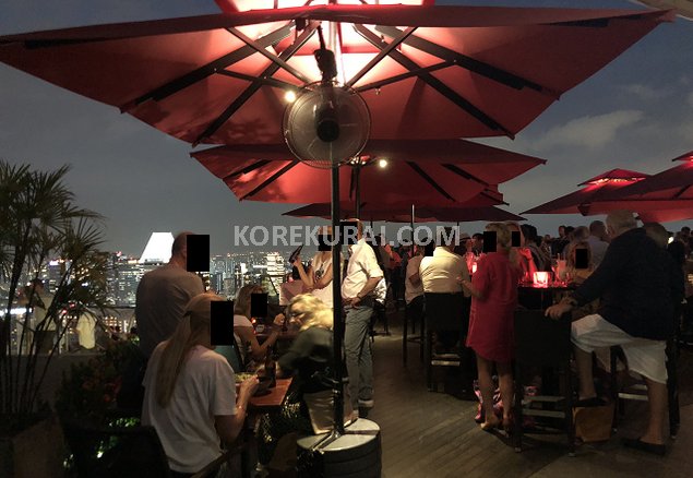 セラビのスカイバーに辿り着いたら、確かに混んでました。座るところは一切空いてなく、満席でした。下の写真のような状態で座れない人たちが立って飲んでる感じ。
